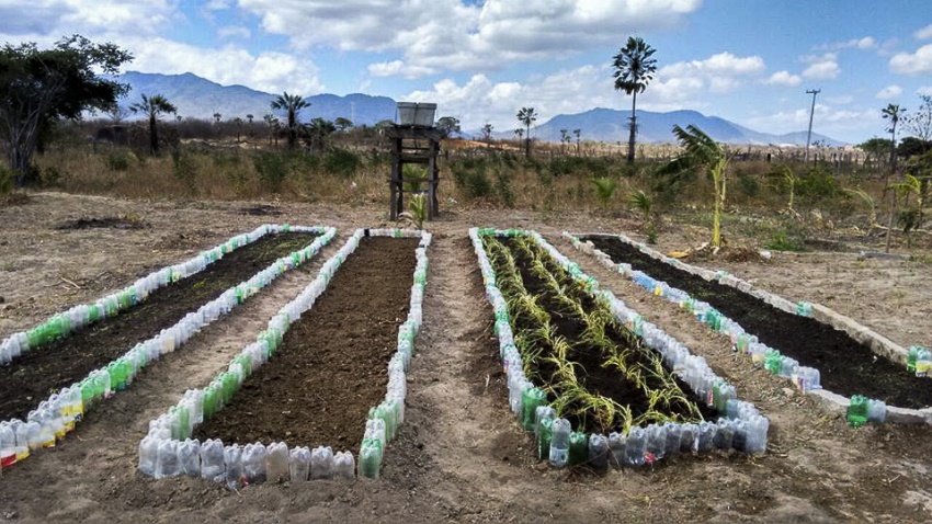 Outro problema: a qualidade do solo que era muito pobre e ácido. Ao constatar as deficiências, os estudantes decidiram umedecer o solo. Para isso, utilizaram garrafas pets para dividir o canteiros do terreno, colocando água até a metade. As garrafas foram “plantadas” de cabeça para baixo, umedecendo o solo.